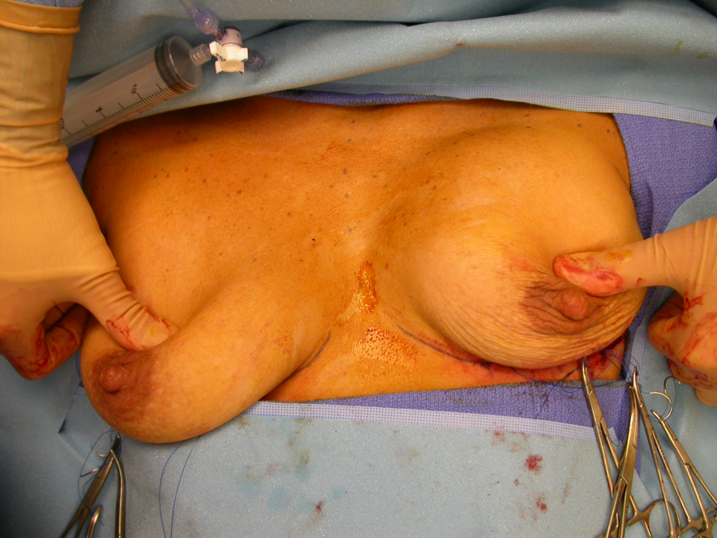 This is an intraoperative view of the IBSA procedure showing the internal suspension effect on the patient’s left breast. The internal glandular lift has repositioned the left breast tissue into the upper pole of the breast.Pressure on the breasts demonstrates the new position of the left breast and the old position of the right breast.Implants have not yet been placed.